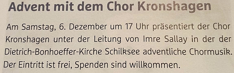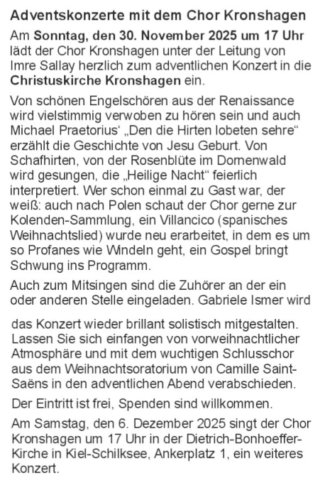 in der Christuskirche Kronshagen und der Dietrich-Bonhoeffer-Kirche Kiel-Schilksee, jeweils 17 Uhr